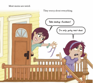 BB: You had me at your love for My Parents Won’t Stop Talking. That thing was brilliant. All right, hard hitting question now. They can’t all be softballs, after all. What is your favorite gag in these books? Because personally I’m torn between the kid whose dad is into the obscure team The Denver Doorbells (Jeff Harter went above and beyond with that one) and the mom who gives her daughter back-up shoelaces, just in case.