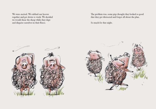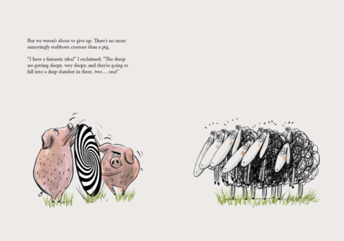 Expressive eyebrows abound! So the same team that did a picture book called The Flock a couple years ago has come out with a companion picture book. Don’t worry, though. You won’t need to have seen the first book to understand what’s happening in the second. In this tale, a drove of pigs are looking at the sheep from the first book and wondering why they don’t get counted. Ever proactive, they proceed to hypnotize the sheep to go on vacation and then, when young Johnny needs to sleep, he discovers an entirely new animal shows up to take over. Needless to say, he’s a little confused, ever as the pigs discover that the job is harder than it looks.